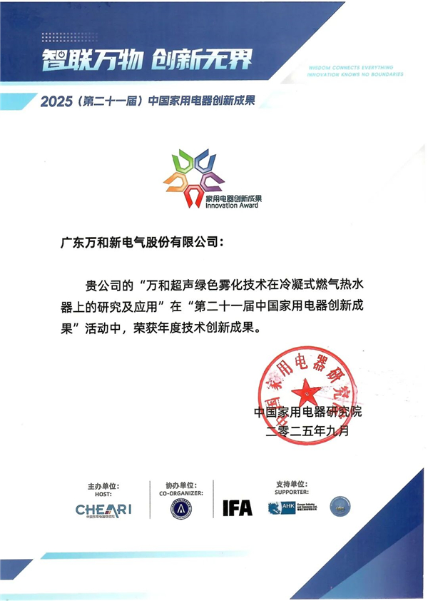 其中,广东万和新电气股份有限公司的“超声绿色雾化技术在冷凝式燃气热水器上的研究及应用”,凭借对行业痛点的颠覆性解决能力与标杆性价值,成功斩获“年度技术创新”荣誉称号。这一荣誉的背后,不仅是一项技术成果的高光亮相,更是中国家电企业从产品输出向技术标准输出的里程碑事件。