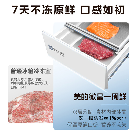 上了一天班回家做饭先要等肉化冻,热水解冻、微波炉解冻口感流失,这个痛点困扰了用户许多年。美的冰箱洞察这一用户需求,2018年行业首发微晶一周鲜技术,引领行业第一次实现了肉类口感保鲜的效果。这项技术的核心突破在于对冰晶形态的掌控:通过智能温控系统实时感知食材冰点变化,精准调控冷量输送节奏,最终在食材内部形成尺寸仅为头发丝直径1%大小的微晶颗粒。这种极细微的冰晶结构从物理层面规避了传统冷冻的弊端——既不会刺破肉类食材细胞膜导致营养流失,也不会破坏肌纤维结构造成口感发柴,真正实现了“在保鲜中锁鲜”的效果。