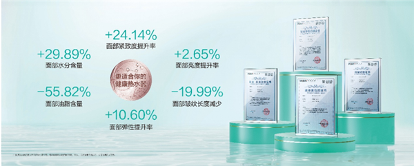 权威测试机构谱尼测试集团深圳有限公司出具的报告显示:使用华帝美肌浴热水器28天后,受试者面部水分含量提升29.89%,面部油脂含量降低55.82%,面部皱纹长度减少19.99%,面部紧致度提升24.14%、弹性提高10.6%、亮度提升2.65%。