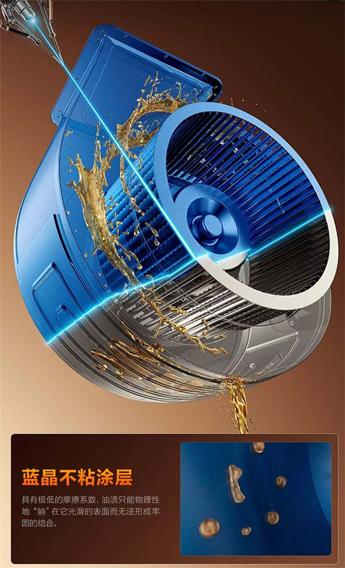 传统油烟机的蜗壳与叶轮通常难以清洗,油污一旦黏附,就会增加电机负荷,导致吸力下降、噪音变大。S1max将蓝晶不粘涂层延伸覆盖至这两大核心部件,油滴接触即滑落,就算面对中式爆炒产生的高温油烟,也不会出现脱落或变形的情况,能长久保持顺滑抗粘,从根源杜绝卫生死角。