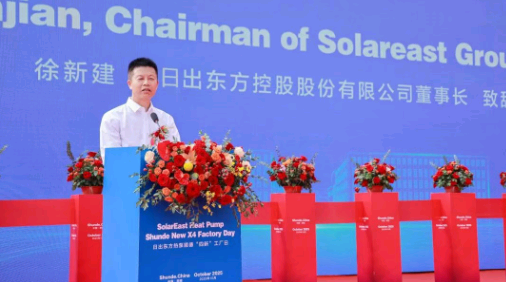 活动伊始,日出东方董事长徐新建登台致辞,向莅临现场的领导、来自全球各地的客户、供应商及企业员工表达欢迎与感谢。他表示,“四新”工厂建设的最终目的,是打造具有国际竞争力的产品,兑现对客户的承诺。徐董还介绍了企业在清洁能源领域的布局:已构建从光热、热泵、储能到光伏直驱电气技术的完整零碳能源应用能力,同时,公司也已经形成覆盖零碳家庭、零碳建筑、零碳园区的系统化解决方案综合能力。期待通过这种能力,为全球客户提供更优质的支持。