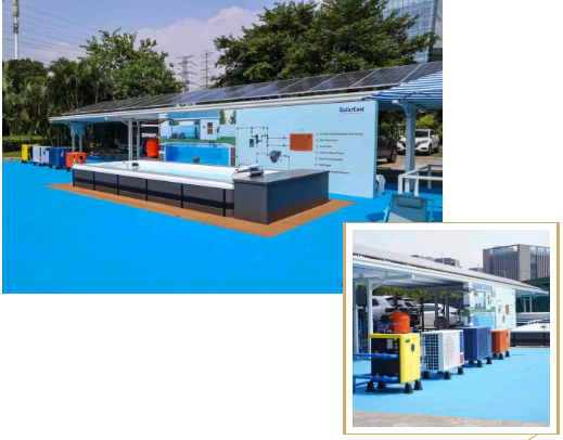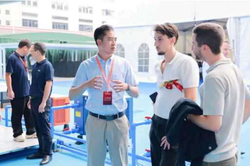 嘉宾们齐聚泳池热泵广场,在技术人员的引导下实地观摩产品运行实况。动态数据屏实时展示着热泵系统的能效表现,嘉宾们或驻足细观设备构造,或通过移动端查看远程监控数据,亲身感受热泵技术的创新突破。