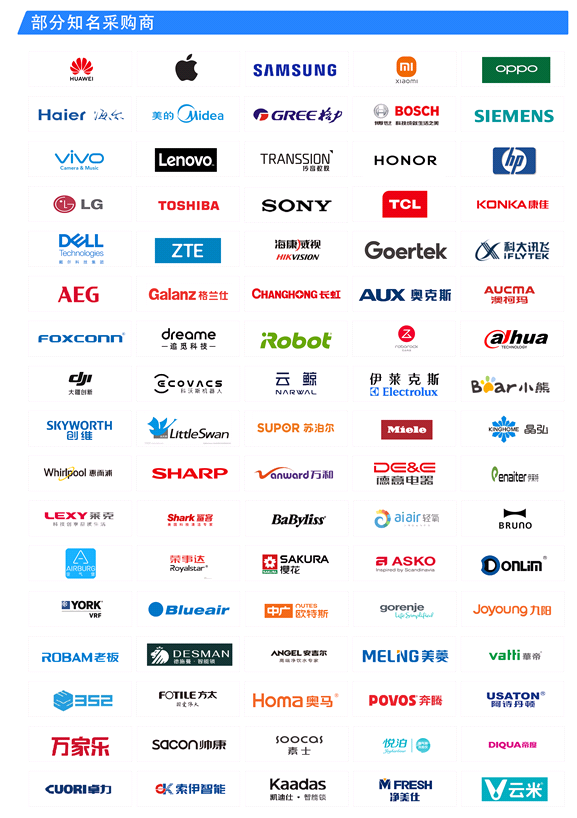 5.部分VIP观众和采购商:海尔、美的、格力、华为、苹果、小米、OPPO、海信、TCL、康佳、联想、荣耀、VIVO、大疆、长虹、创维、奥克斯、博世、西门子、松下电器、东芝、三星、LG、荣事达、格兰仕、美菱、澳柯玛、小天鹅、美大、方太、老板、华帝、帅康、樱花厨卫、阿里斯顿、林内、苏泊尔、九阳、万和、万家乐、AO史密斯、云米、莱克、爱仕达、艾美特、伊莱克斯、伊莱特、小熊电器、安吉尔、净美仕、阿诗丹顿、布鲁雅尔、亚都、戴森、绿岛风、科沃斯、云鲸、石头科技、追觅、一点、晓舞、艾罗伯特等;
