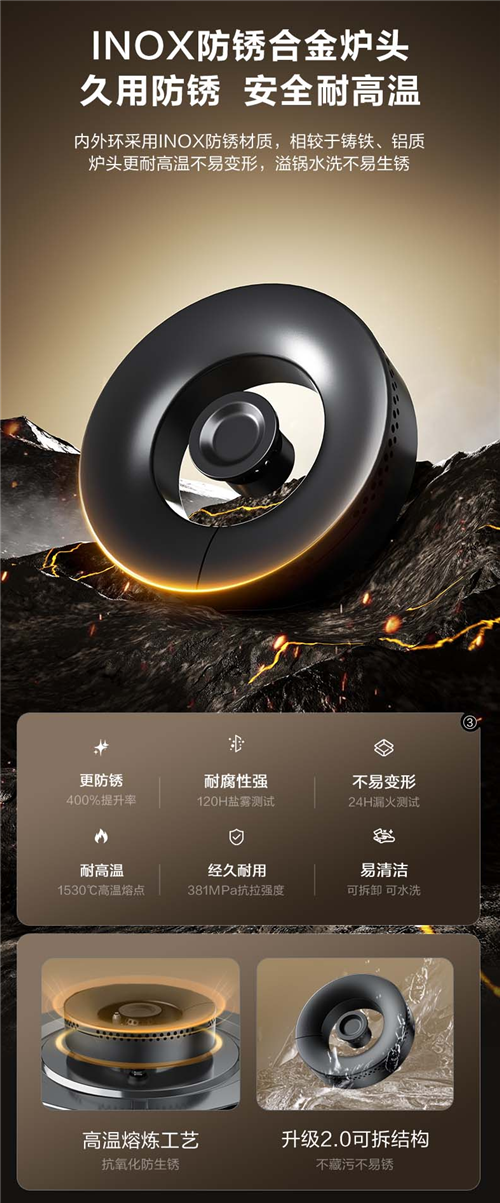 MF1pro的炉头选用了INOX防锈合金材质。这种材质耐高温性能极佳,经过24小时漏火测试也毫无变形痕迹,防锈性能更是比铸铁提升了400%。即使每天进行高温爆炒,炉头也不会变形,水洗后还能迅速晾干,避免了因积水导致的内部锈蚀问题。