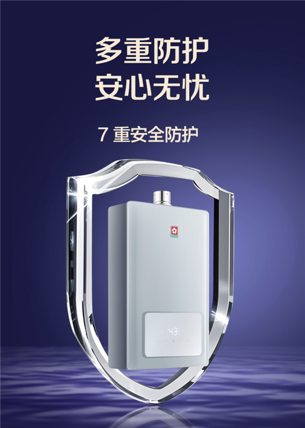 安全性能全面加倍升级,樱花燃气热水器Q802A设置开机故障自检、点火失败保护、意外熄火保护、残火检测、干烧保护、燃气泄漏与过热保护等七重防护系统,更有母婴专属模式,可一键切换婴幼洗浴模式,用心守护家人的用水安全。