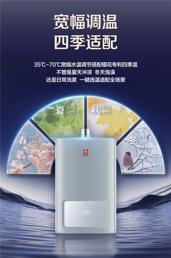 樱花燃气热水器Q802A支持35℃-70℃宽幅水温调节,搭配樱花专利四季温技术。无论是夏天冲凉、冬天泡澡,还是日常洗漱,一键选温即可适配全场景。更有多段精准控温技术,彻底解决水温忽高忽低的问题,让沐浴体验更温润。