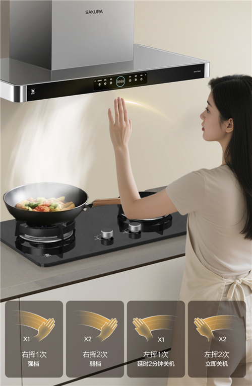 挥手智控系统的设计,让操作更加轻盈便捷。轻轻一挥手,油烟机即可迅速响应,不打断烹饪节奏,更不易在机身沾染油污;同时120秒延时关机的功能,更是在烹饪之余,贴心守护住厨房的持久清新。