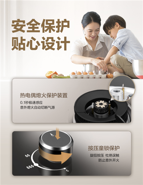 安全防护也同样贴心,樱花燃气灶S507GA搭载热电偶熄火保护装置,可在0.1秒内极速感应,意外熄火时自动切断气源;按压童锁的设计配合压转式开关,让儿童不易开启,防止玩耍时意外开火,杜绝误触危险。