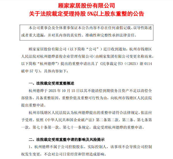 顾家家居公告表明,此次重整事宜不会对顾家家居的控制权造成影响。杭州德烨并非顾家家居的控股股东,也非实际控制人,所以不会引发该公司控制权发生变更。此外,公告还明确表示,即便股东层面的重整正在推进,顾家家居的经营活动仍会正常开展,不会因股东重整事项而受到干扰。