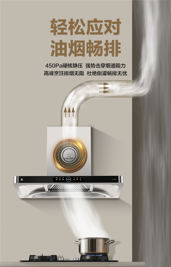 每一餐的烹饪都应是一种愉悦的享受。热油下锅,蒜末与辣椒翻腾出香气,家的味道就此苏醒。可随之升腾的呛人油烟,却常让这份热烈变得不尽纯粹。樱花吸油烟机T302A以25m³/min强悍吸力重磅出击,超强电机瞬锁油烟,浓烟未散即被锁定,轻松还原厨房间里的清新。450Pa硬核静压,强猛突破烟道阻力,不论高层住宅还是复杂管路,都能确保油烟顺畅排出,让厨房空气始终澄澈。