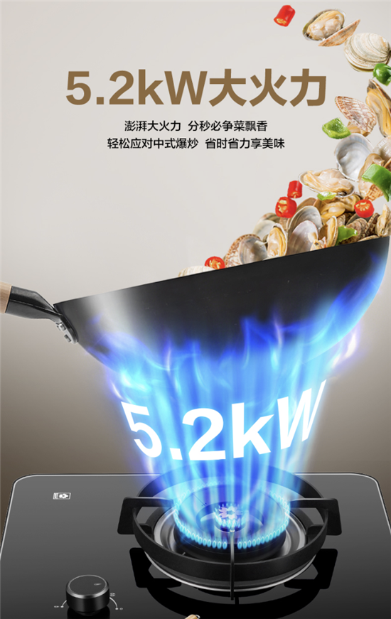 中式烹饪,最讲究精准的火候掌控。樱花燃气灶S507GA以零秒开阀技术实现即点即着,让火焰随心而动,轻松开启舌尖上的曼妙享受。5.2kW澎湃大火力,让食材在高温下迅速锁住鲜嫩与香气,让每一次翻炒都香气四溢,味道鲜美,唤醒满满的食欲。