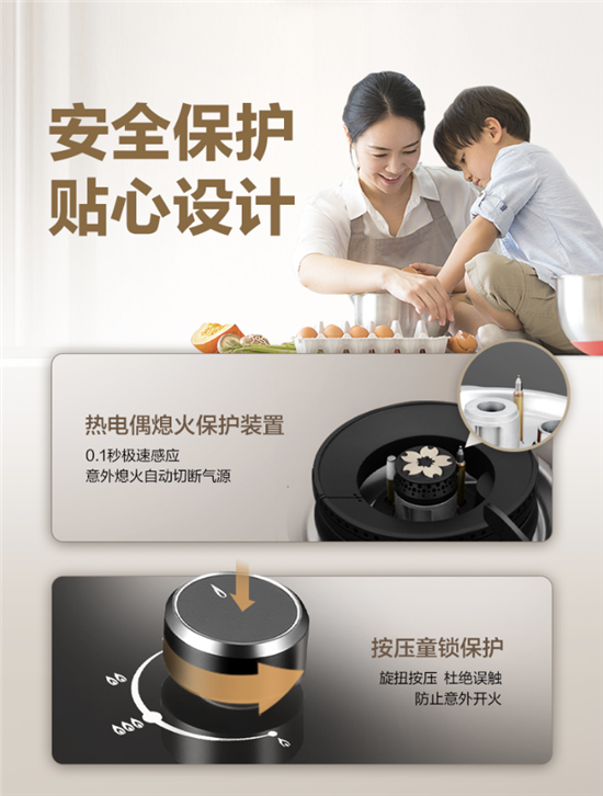 除此之外,樱花燃气灶S507GA还贴心设计多种安全保护装置,如热电偶熄火保护装置,可在0.1秒极速感应,意外熄火时可自动切断气源;按压式的童锁保护,则能有效防止因误触导致的意外开启。周全守护的加持,让用户可全身心投入烹饪,让每一次下厨都安心无虞。