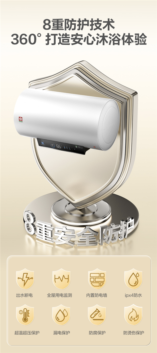 除此之外,樱花电热水器EH505更为用户贴心设计出水断电保护、全屋用电监测、内置防电墙、ipx4防水、超温超压保护、漏电保护、防腐保护、防烫伤保护等八重安全防护系统,从源头守护生活用水的安全,打造无忧的用水体验。
