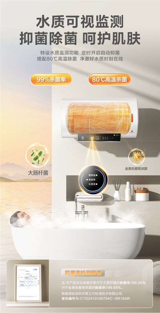 以科技守护美好生活,樱花电热水器EH505特设水质监测功能,支持定时开启自动抑菌模式,结合80℃高温除菌,让每一滴水都净澈温暖;更有高匀度致密蓝晶珐琅层,经870℃高温烧结的均匀覆盖,高承压、强耐腐的特性,让樱花电热水器EH505久用如新;终身免换的铂晶耐腐镁棒,亦可有效抑制水垢的产生,持久保护内胆,为肌肤带来健康的呵护。