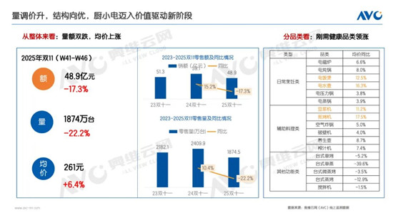 奥维云网(AVC)监测数据显示,2025双十一(W41-46,10月6日至11月16日)厨小家电(包含品类:电饭煲、电磁炉、电炖锅、电水壶、电蒸锅、电压力锅、豆浆机、破壁机、搅拌机、榨汁机、煎烤机、养生壶、空气炸锅、台式微蒸烤)在线上全渠道零售额同比下降17.3%,零售量同比下降22.2%,反映出消费需求朝着更理性的方向发展。与此同时,行业整体均价上涨6.4%,显示消费结构正在向更高价位产品倾斜。从品类价格来看,多个主销品类均价明显上扬。电水壶、电饭煲、电炖锅等日常烹饪类厨小电均价分别上涨16.3%、12.5%、8.0%,煎烤机、豆浆机、养生壶、榨汁机等辅助料理类,厨小电均价分别上涨17.5%、11.2%、8.7%和7.4%。当前市场正处于政策刺激后的理性回调阶段,随着消费节奏回归常态,叠加居民消费信心逐步修复,市场有望在后续周期中实现更可持续的增长。