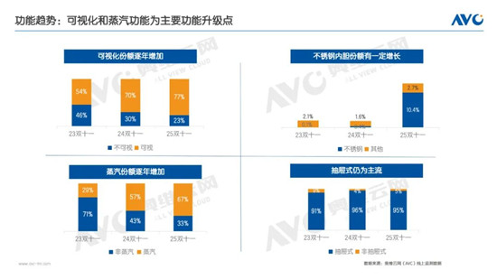 可视化与蒸汽功能正驱动空气炸锅品类的全面升级。奥维云网(AVC)监测数据显示,可视化机型份额从2023年双十一的54%快速提升至2025年双十一的77%,增长23%,可视化空气炸锅借鉴烤箱监控优势,实时掌握食材状态,防烤糊更安全。与此同时,蒸汽功能呈现更为显著的爆发态势,其份额从29%跃升至67%,已取代传统型号成为市场主流。这一趋势背后是双重需求的满足:在烹饪效果上,蒸汽嫩炸技术有效改善食物口感,避免干柴;在功能集成上,则通过融合蒸、烤、炸、烘焙等多种模式,以“一机多用”契合了厨房空间集约化和使用便捷化的消费趋势。两大功能升级路径共同表明,空气炸锅已从单一的替代油炸工具,逐步演进为注重体验、健康与效率的现代厨房中心设备。