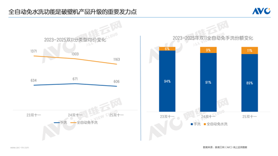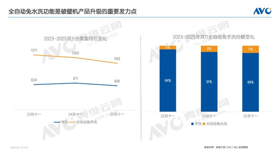 全自动免手洗破壁机份额提升、价格更亲民,加速高品质厨房体验普及。奥维云网(AVC)线上监测数据显示,2025年双十一期间,全自动免手洗破壁机零售额份额达到11%,份额提升2%。该品类凭借其“免手洗”的核心功能,精准解决了传统破壁机存在的清洗困难、渣滓残留和细菌滋生等痛点,不仅满足了消费者追求便捷的需求,也降低了因手动清洗导致割伤等安全隐患,因此成为市场产品升级的重要方向之一。