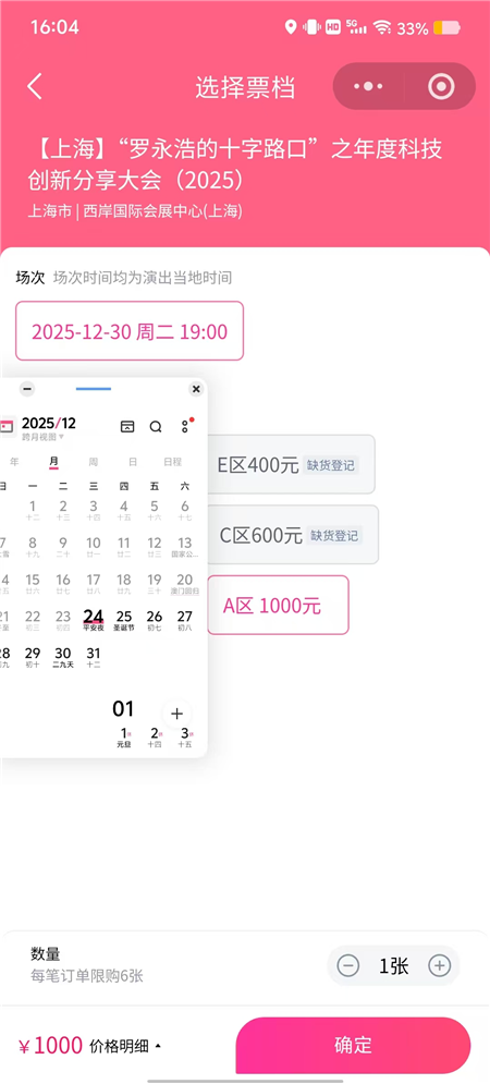 12月22日中午12时,罗永浩“科技春晚”门票在大麦平台开售。本次大会全称为:“罗永浩的十字路口”2025年度科技创新分享大会,2025年12月30日将在上海召开。