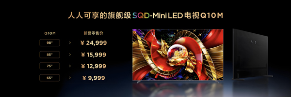 与此同时,人人可享的SQD-Mini LED旗舰级产品TCL Q10M也一并上市,同样搭载SQD-Mini LED技术,拥有碾压同价位产品的100% BT.2020全局高色域,配备最新的超级量子点技术,屏幕也直接一升到顶,配备超级蝶翼华曜屏,98吋、85吋、75吋、65吋零售价分别为24999元、15999元、12999元、9999元。作为技术普惠的标杆之作,Q10M代表着TCL大幅降低了SQD-Mini LED体验门槛,让用户真正触手可及。