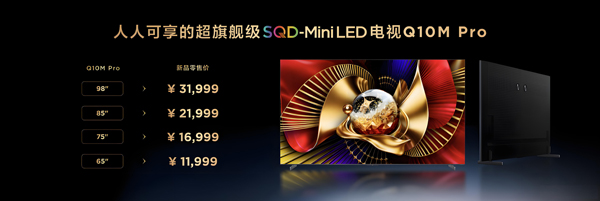 此次,TCL Q10M Pro共推出4个尺寸版本,零售价分别为:98吋31999 元、85吋21999元、75吋16999元、65吋11999元,于2026年1月5日开启预售,1月15日正式开售。