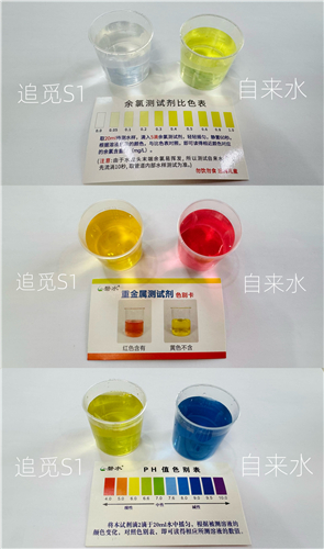 重金属检测中,水体会变成黄色表示不含重金属。追觅S1过滤的水呈现黄色,自来水呈现为明显的红色。