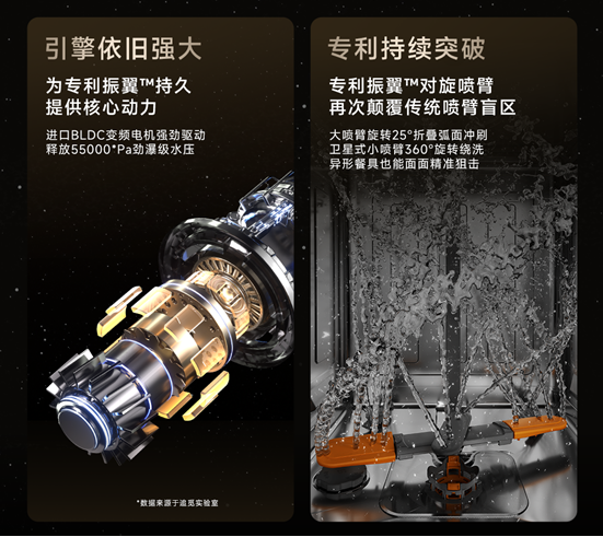比如,在《马上春晚》上演示的追觅洗碗机,为何能够打消高端用户清洁覆盖死角顾虑?正是得益于追觅厨电自研的“振翼喷淋臂”。相比于传统固定翼喷淋臂,追觅采用仿生柔性结构和镍钛合金材料,实现了喷淋臂的3D折叠,同时叠加污渍传感器以及核心人工智能算法,可以针对不同区域的脏污程度,自动改变两边折叠的角度,从而达到全腔百分百覆盖,即便碗盘随意摆放,亦可实现全域无死角的深度洁净。