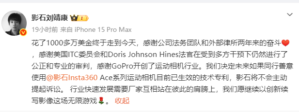 3月2日,影石创新(Insta360)创始人兼CEO刘靖康在微博平台正式回应了美国“337调查”。