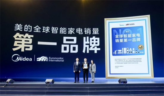 欧睿中国区总经理穆愔为美的颁发2025年全球智能家电销量第一证书,中国家电研究院副院长曲宗峰现场见证。