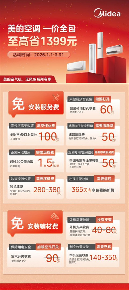 具体来看,可以分为两个部分:一免安装服务费,即高空作业费、远程安装费、移机费、打孔费、和布线服务(人工)费等安装服务费用全免;二免安装辅材费,即外机支架、空气开关等安装辅材费全免。用户还可以在安装后一年内,享受免费清洁一次、免费充氟一次,如果产品出现性能故障,则直接享受免费更换新机服务。真正做到“一价全包”,省心到底。