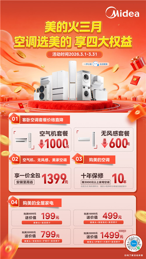 美的“火三月”更给出安心承诺:购买3000元以上家用空调尊享10年保修,家用中央空调全系延保至10年。(消费者可前往线下美的智慧家门店选购,详情咨询线下门店。)