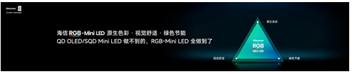 作为全球显示技术的重要突破,海信RGB-Mini LED技术的落地,终结了行业长期以来在画质、健康、能效之间的取舍困境。此前,传统QD-Mini LED、SQD-Mini LED等技术因采用单色背光方案,需通过量子点激发、滤光等二次转换实现色彩呈现,不可避免地出现高亮色彩冲淡、白色光晕明显、能耗偏高、有害蓝光占比大等问题,即便增加控光分区数量,也难以从底层解决这些痛点。海信E7S Pro搭载的全新RGB-Mini LED技术体系,由玲珑真彩背光与信芯AI画质芯片H7构成核心双引擎,通过对光源、算力、光学架构的全链路重构,实现了“始于画质、合于能效、归于健康”的行业突破。