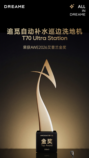 在本届AWE 2026展会期间,追觅T70 Ultra Station获得了家电界最高荣誉--艾普兰奖金奖,也是本届展会唯一一个获得艾普兰金奖的洗地机品牌,以创新实力再次展现了品牌在洗地机领域的领先实力。
